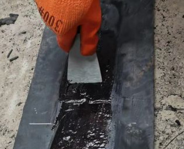 第五:缓慢的经混合液体倒入输送带的开裂处,用刮刀将开裂处的混合液涂平整。